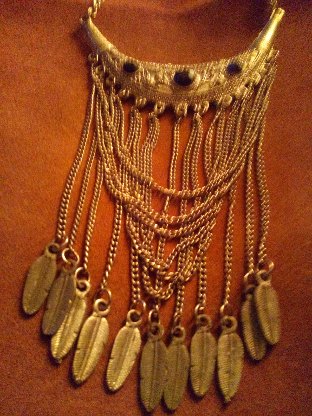 Western Style Necklace With Black Gem and Dangling Chains With Feathers