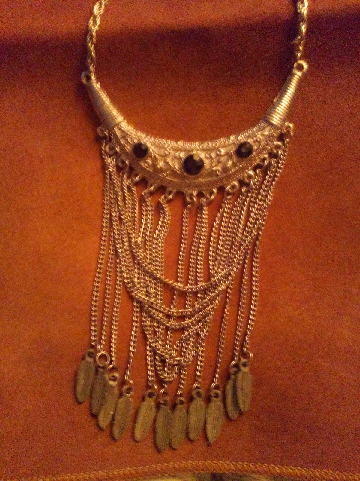 This is in good condition . It is 30 " long . Very nice necklace . A statement piece .The black gems arr plastic .