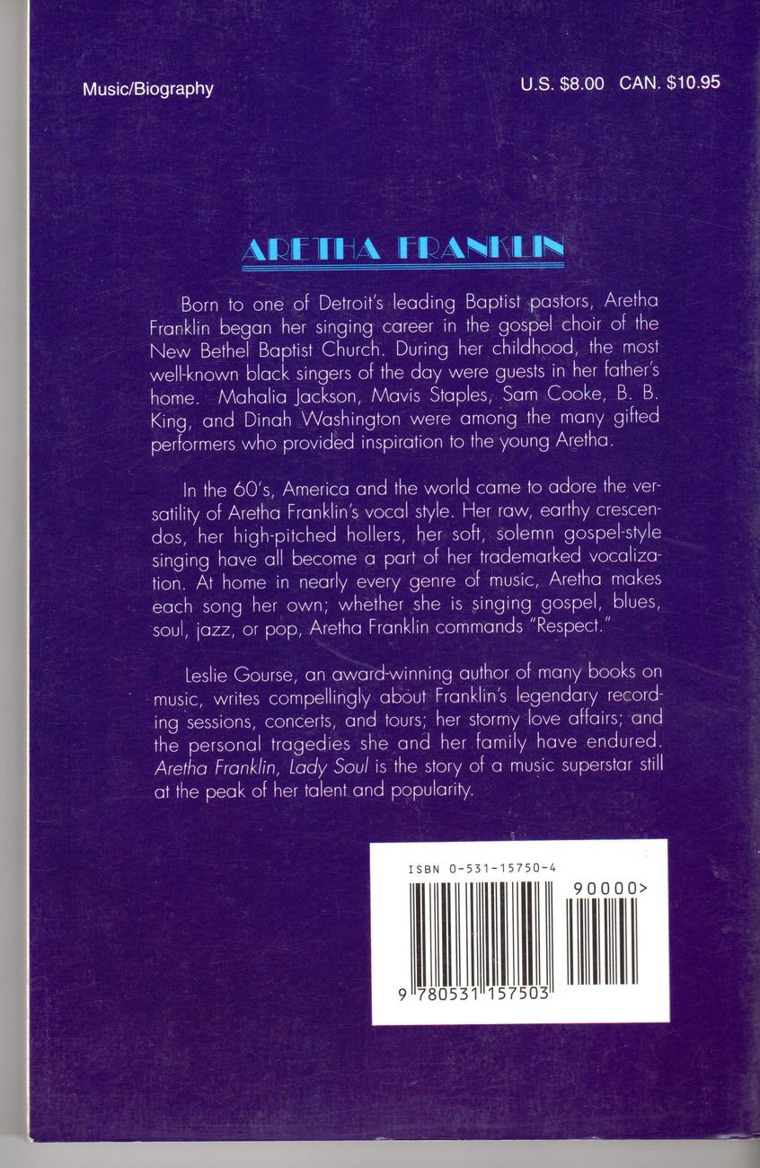 Gr 7 Up--Gourse chronicles the personal life and musical development of the multidimensional singer, whose voice and music have been influenced by blues, gospel, soul, and jazz. The daughter of a Baptist minister, Franklin made her first gospel recording at age 14; by age 18, she had signed with Columbia Records. Information is included about her troubled marriages and legal problems. This detailed and well-written book meets a need for solid biographies of famous African American women. It will also appeal to students of music and history looking for an interesting, well-researched title. Well-reproduced black-and-white photographs add visual interest.