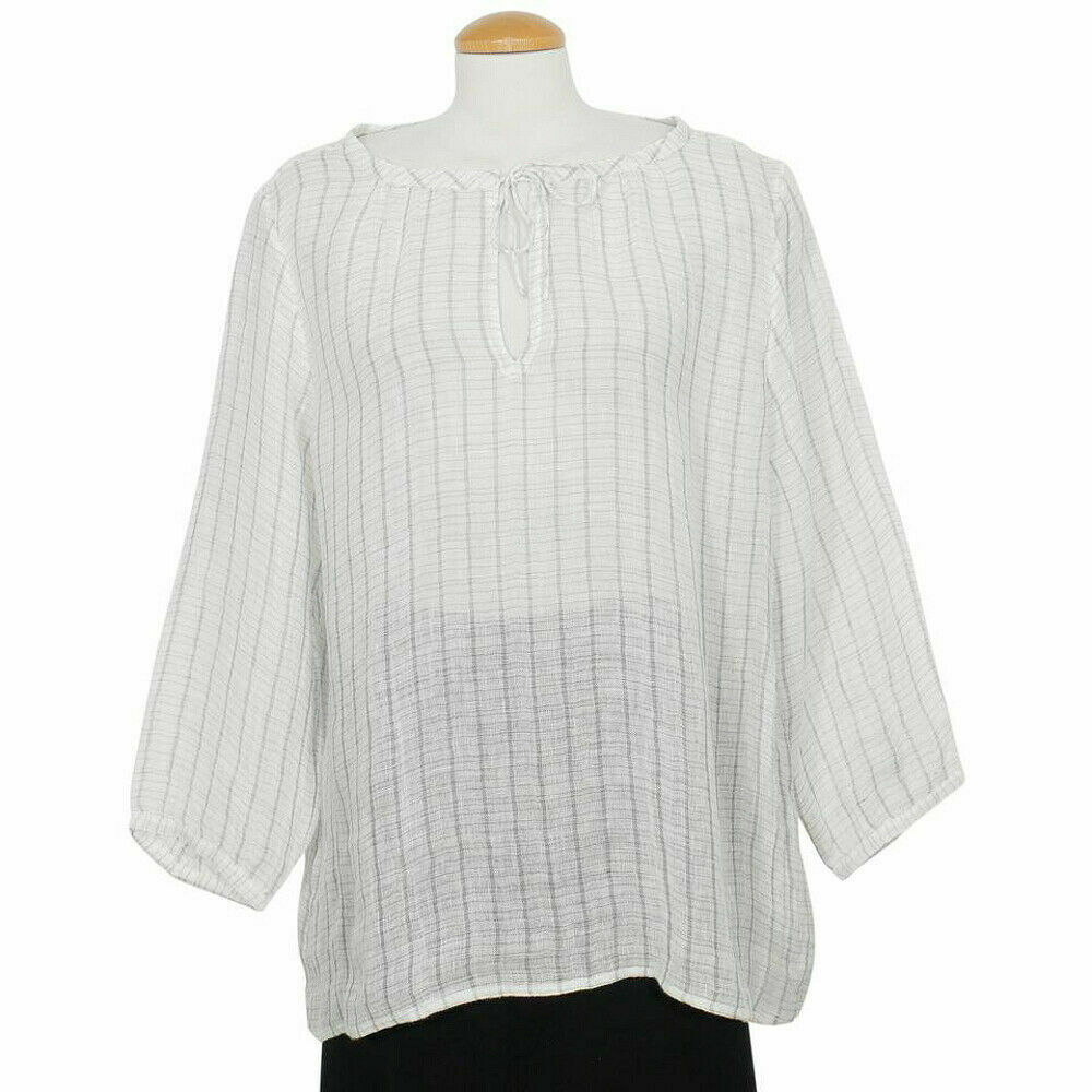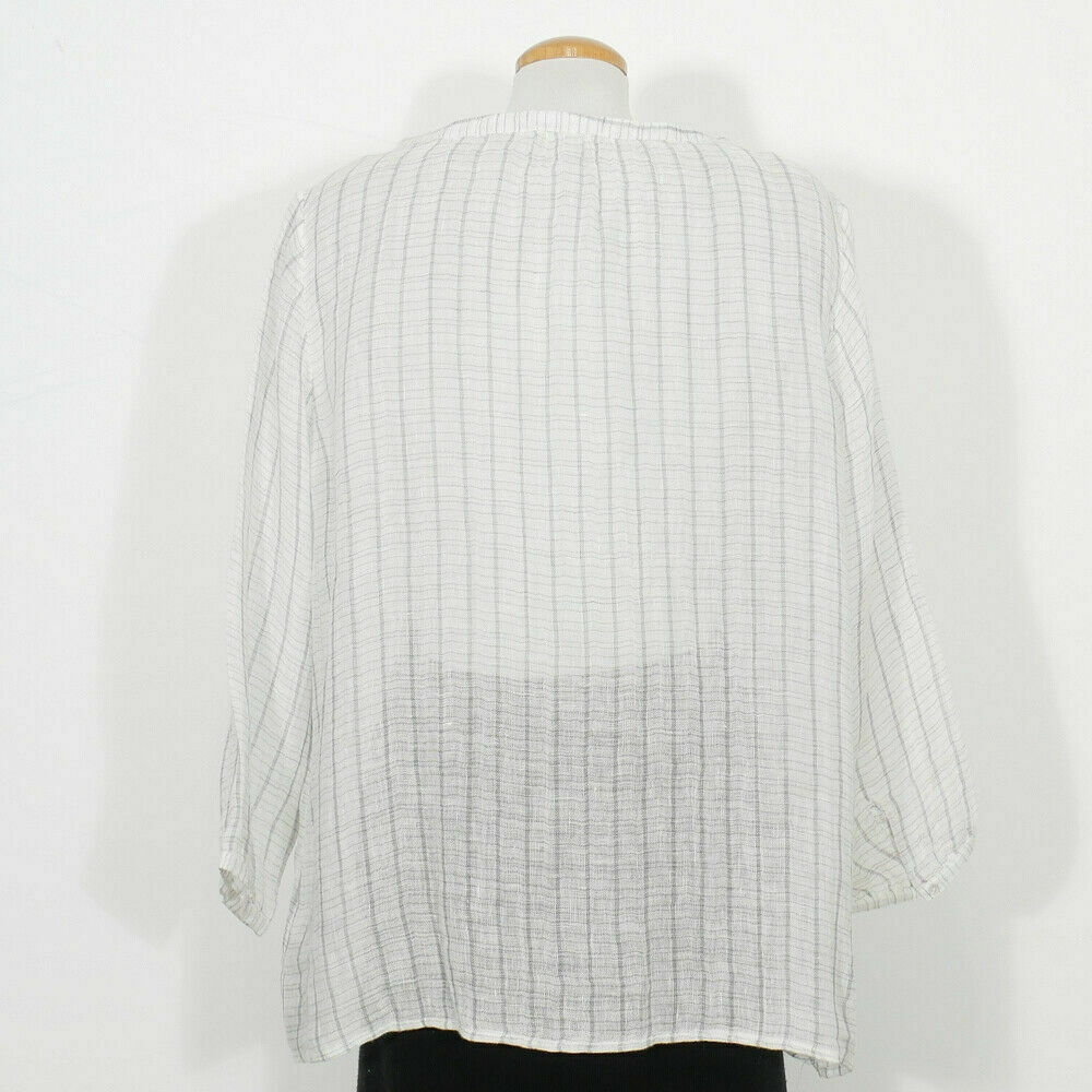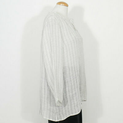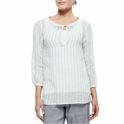 EILEEN FISHER Pewter Gray Ivory Linen Gauze Windowpane Split Neck Top PP