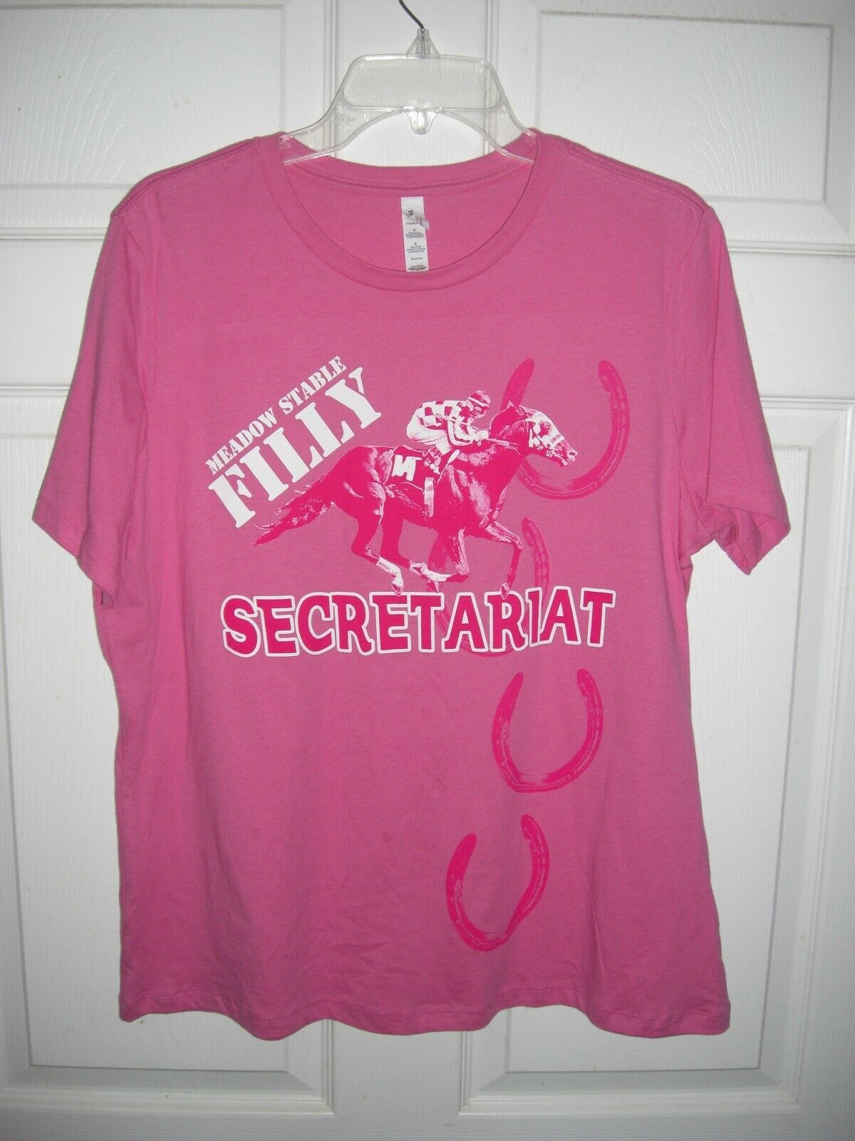 This is a Size Large SECRETARIAT - "Meadow Stable Filly" Pink T- Shirt in NEW, UNUSED and MINT Condition. FREE First Class Postage shipping in the U.S.A. International Priority Mail Postage shipping cost will be determined by the Country of the buyer. If you buy more than one item please pay for all the items with one combined PayPal payment rather than paying for each item individually.