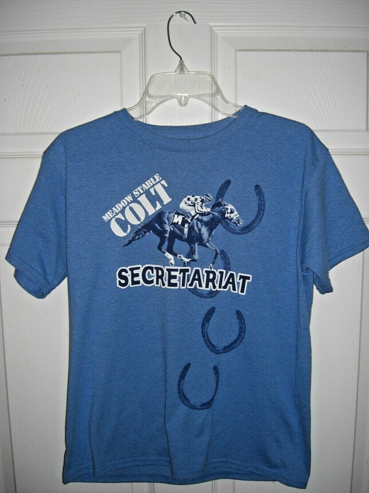 This is a Size Large SECRETARIAT - "Meadow Stable Colt" Blue T- Shirt in NEW, UNUSED and MINT Condition. FREE First Class Postage shipping in the U.S.A. International Priority Mail Postage shipping cost will be determined by the Country of the buyer. If you buy more than one item please pay for all the items with one combined PayPal payment rather than paying for each item individually.