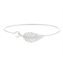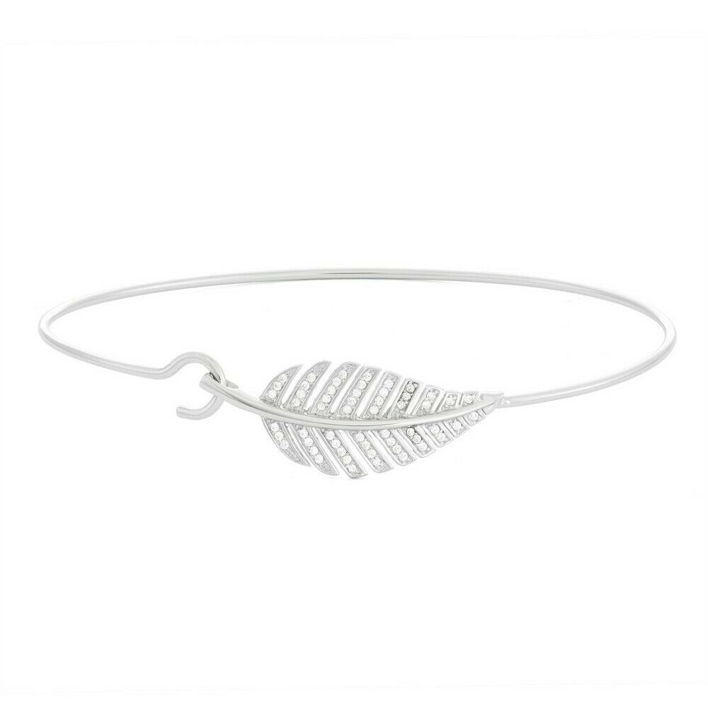 Sterling Silver Feather Charm Clear CZ Fish-hook Bangle Bracelet