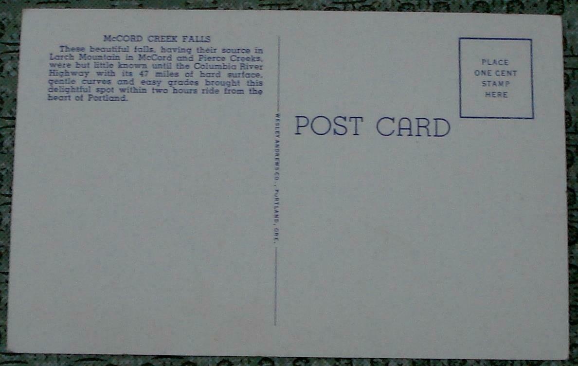 You are bidding on this nice Color Tone postcard, McCord Creek Falls, Columbia River Highway, Oregon. The postcard is in good condition, with some light wear at the corners and edges, and some light stains and yellowing on the back and front. There is some yellowing on the back on this card, and some moisture staining on the back and front of this card as well. The postcard is un-used postally, and has a caption on the back that reads; These beautiful falls, having their source in Larch Mountain in McCord and Pierce Creeks, were but little known until the Columbia River Highway with its 47 miles of hard surface, gentle curves and easy grades brought this delightful spot within two hours ride from the heart of PortlandโฆIt is 3.5โ by 5.5โ and is a nice Color Tone postcard.
