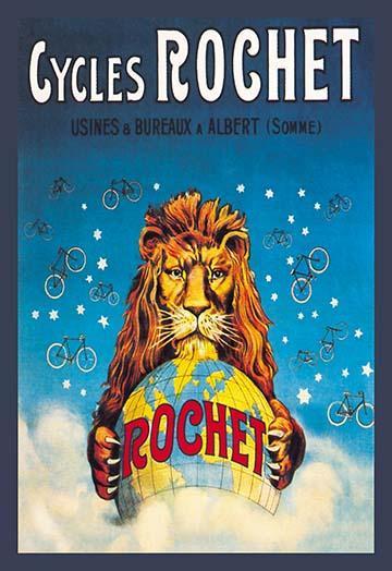 20inch x 30inch Poster Bicycle advertising poster showing a lion clutching a globe in its claws as bikes adorn the backround. Cycles Rochet was one of France??s premier bicycle manufacturers at the turn of the 20th century, turning steel tubes into beautiful works of cycling art. There is a border around the image. The image size is correct.