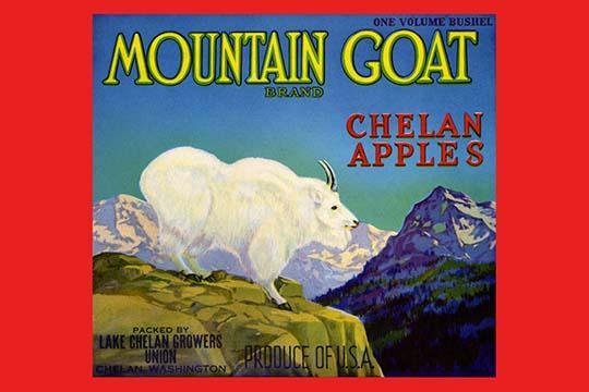 20inch x 30inch Poster An early fruit crate label with a mountain goat as the symbol for apples from Lake Chelan in Washington state. Vegetable and Fruit crate labels were produced between the 1890's and 1950's to highlight one brand over another and increase sales in a market with fierce competition. Printed cardboard boxes made this art form obsolete. There is a border around the image. The image size is correct.