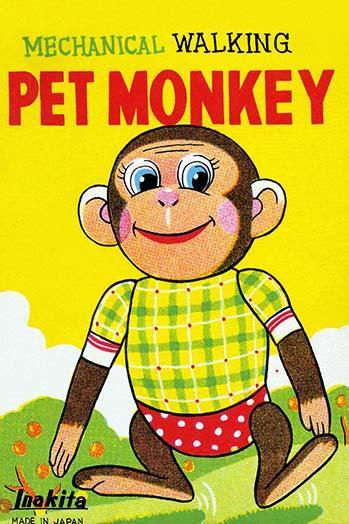 20inch x 30inch Poster A very happy and fully dressed chimpanzee walks upright. Children who bought this vintage toy could pretend they had a put monkey that would walk around for them. The graphic art from an antique Japanese tin children's toy from the 1950's. Often the box art was much more enjoyable than the toy inside. There is a border around the image. The image size is correct.