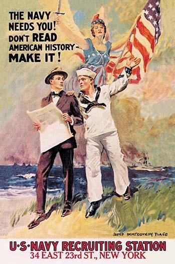 20inch x 30inch Poster College students were encourage to enlist, as well. Here a sailor tells a young man in a suit, ??Don??t read American history ?? make it!?? Created by James Montgomery Flagg (1877 ?? 1960) was an American artist and illustrator. He is most famous for his war effort posters but he also work for magazines, did cartoons, and even paintings. Published by the H.C. Miner Litho co. New York. There is a border around the image. The image size is correct.