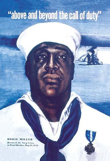 20inch x 30inch Poster "Above and Beyond the Call of Duty -- Dorie Miller." Although the Navy was still segregated, Doris ("Dorie") Miller joined the Navy as a messman and was on board the U.S.S. West Virginia during the 7 December 1941 attack on Pearl Harbor. Messmen received no gunnery training, but during the attack, at great personal risk, Miller took over a weapon after another man was wounded and succeeded in hitting Japanese planes. He was later awarded the Navy Cross for his heroic deeds. This poster was produced by the US Government as part of a campaign to reconcile racial tensions for the good of the war effort. There is a border around the image. The image size is correct.