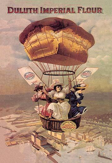 20inch x 30inch Poster Duluth Imperial Flour - Loaf of Bread Rises above the Minnesota skyline and the Mississippi River at Duluth carrying women in the basket. The image was used on print ads as well with the following poem attached, ??As our airship proudly raises / on high we hear the praises / and our song the world amazes / By its truth, / For we sing of product cereal / Which makes our bread ethereal / And is known as flour ??imperial?? / From Duluth.?? The mill was operational from 1889 to 1905. There is a border around the image. The image size is correct.