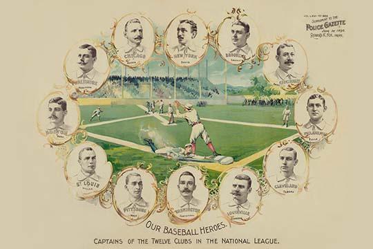 20inch x 30inch Poster captains of the twelve baseball teams in the National League, arranged around a scene showing a base-runner attempting to steal second base during a baseball game. Clockwise, from the top are: George Davis of New York, Michael J. Griffin of Brooklyn, William "Buck" Ewing of Cincinnati, John A. Boyle of Philadelphia, Oliver W. "Patsy" Tebeau of Cleveland, John Wesley Glasscock of Louisville, Edward C. Cartwright of Washington, Connie Mack of Pittsburg, George F. "Doggie" Miller of St. Louis, Billy Nash of Boston, Wilbert Robinson of Baltimore, and Adrian "Cap" Anson of Chicago. - There is a border around the image. Image size is correct.