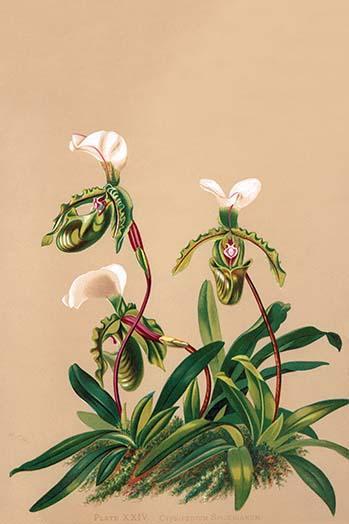 20inch x 30inch Poster One of the prettiest Lady's Slipper from East Indies. The leaves resemble C. villosum, the flower is borne singly on a stem 4 to 6 inches high. The dorsal sepal is nearly 2 inches long, pure white with a purple stripe in the center, petals green, undulated lip greenish yellow, column purple and white. Grows best in pots with sphagnum, fibrous peat, charcoal and potsherds, requires good supply of water during the growth, and should not even in the resting season suffer from draught; it requires a temperature of 6o?? Fahrenheit. Propagated by division. - There is a border around the image. Image size is correct.