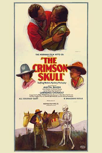 20inch x 30inch Poster Three panel motion picture poster for "The Crimson Skull" showing, in the top panel, a woman resisting the embrace of a man attempting to kiss her; in the middle panel appear the title and credits along with bust portraits of "Anita Bush" and "Lawrence Chennault"; the bottom panel shows "the one legged marvel, Steve Reynolds" holding a bottle of liquor and standing next to a horse, and Death, as a skeleton, standing at the rear end of the horse, facing Reynolds and gesturing for him to come; at the top of the bottom panel appears: Norman Film MFG. Co. Jacksonville, Fla. - There is a border around the image. Image size is correct.