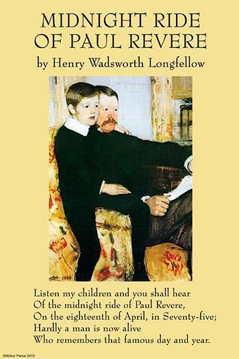 20inch x 30inch Poster The poem is spoken by the landlord of the Wayside Inn and tells the fictionalized story of Paul Revere. In the poem, Revere tells a friend to prepare signal lanterns in the Old North Church to inform him if the British will attack by land or sea. He would await the signal across the river in Charlestown and be ready to spread the alarm throughout Middlesex County, Massachusetts. The unnamed friend climbs up the steeple and soon sets up two signal lanterns, informing Revere that the British are coming by sea. Revere rides his horse through Medford, Lexington, and Concord to warn the patriots. Illustrated by Mary Cassatt of two family members. Cassatt's brother and nephew posed for this double portrait during a visit to the artist in Paris. She not only painted several portraits of her brother, a prominent Philadelphia businessman, but also advised his art collecting. As a result, he was one of the first in Philadelphia to own works by the French Impressionists. - There is a border around the image. Image size is correct.