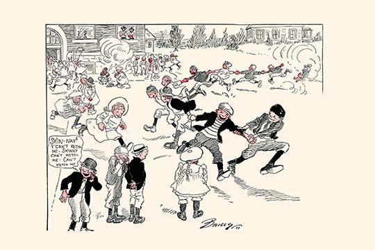 20inch x 30inch Poster A cartoon of children exiting the school for recess and doing a series of activities from jumping rope to tag. The cartoon was drawn by Clare Briggs for the book "Oh Skin-nay! The Days of Real Sport" in 1913. The book was written by poet Wilbur D. Nesbit and portrays a year in the life of small-town America through the eyes of the twelve-year-old boy - wood gathering, sleigh rides, games of post office, swimming holes, and sandlot ball games. - There is a border around the image. Image size is correct.