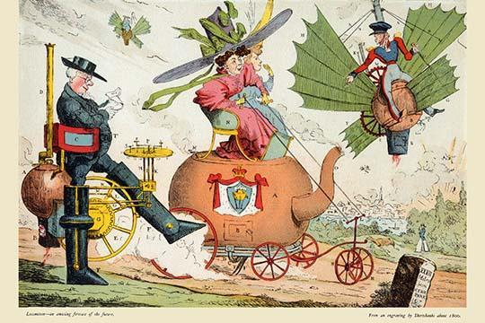 20inch x 30inch Poster An engraving of what the artist imagined the future to look like. Women travel by steamed powered teapot, a man uses steam powered legsl, and another flies in the air on steam powered wings. - There is a border around the image. Image size is correct.