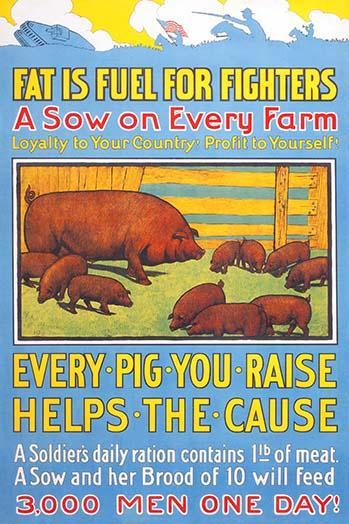 20inch x 30inch Poster WWI poster for the homefront. "A sow on every farm. Loyalty to your country; profit to yourself. Every pig you raise helps the cause. A soldiers daily ration contains one pound of meat. A sow and her brood of 10 will feed 3,000 men one day!" - There is a border around the image. Image size is correct.