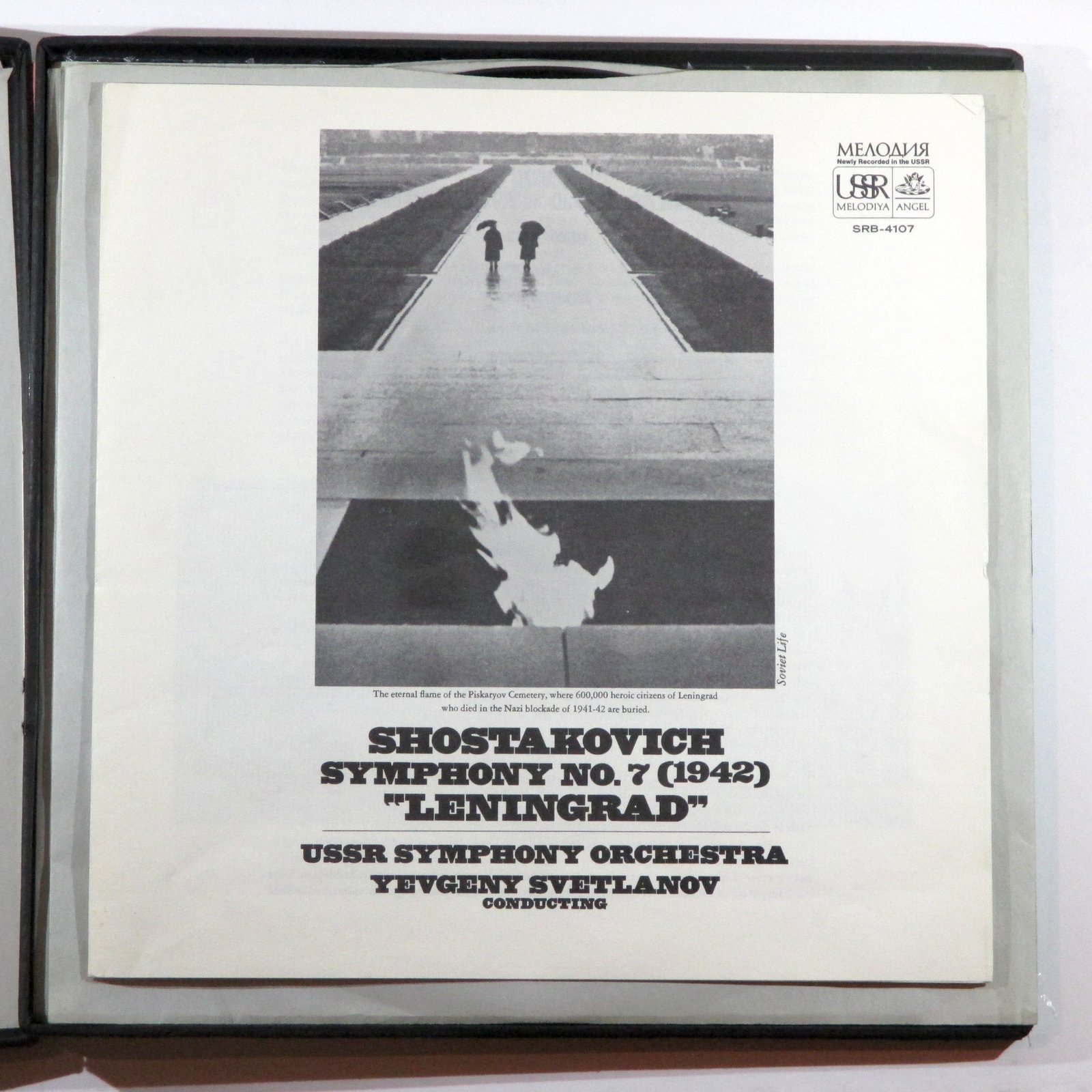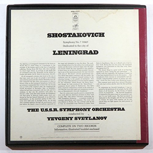 Product description: This is a 2-LP box set of 33-1/3 RPM stereo long-playing records of the Symphony No. 7 ("Leningrad") by Dmitri Shostakovich, performed by the USSR Symphony Orchestra, conducted by Yevgeny Svetlanov. Label is Melodiya/Angel, number SRB-4107, made in USA.