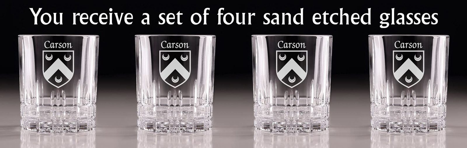 Carson Irish Coat of Arms Cut Glass Tumblers - Set of 4. Pour your favorite beverage and enjoy it in luxury! These Spiegelau Perfect Serve double old fashioned glasses are the perfect way to elevate your home glassware! Featuring an elegant retro, cut-glass design and your very own Irish Coat of Arms expertly hand-sandblasted onto each tumbler, this glass is sure to impress! Made with Spiegleau's unique Platinum Glass process to eliminate imperfections in the glass, they're thick-walled, heavy weighted, and crystal clear!