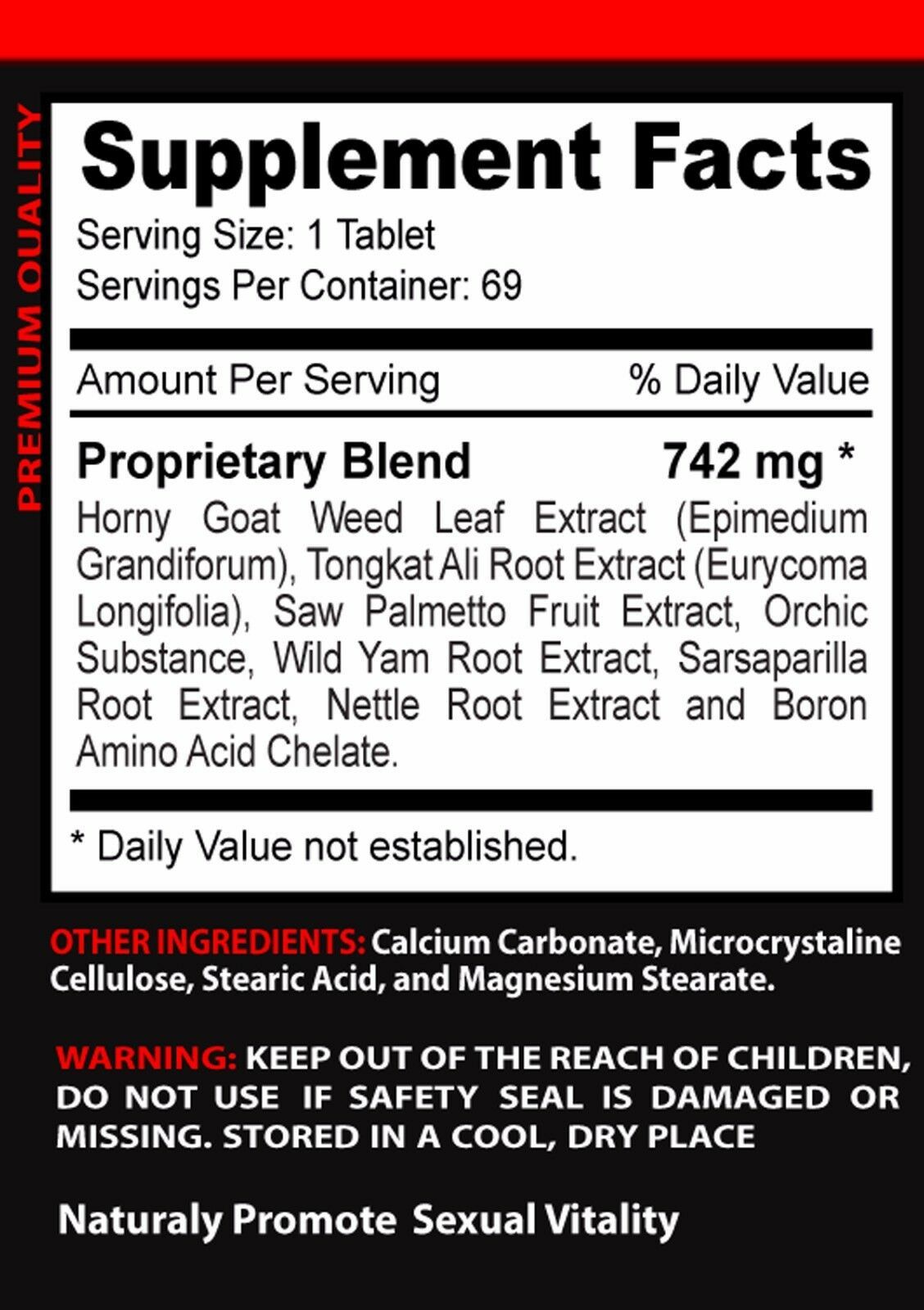 Horny Goat Weed Leaf Extract (Epimedium Grandiforum), Tongkat Ali Root Extract (Eurycoma Longifolia), Saw Palmetto Fruit Extract, Orchic Substance, Wild Yam Root Extract, Sarsaparilla Root Extract, Nettle Root Extract, Boron Amino Acid Chelate.