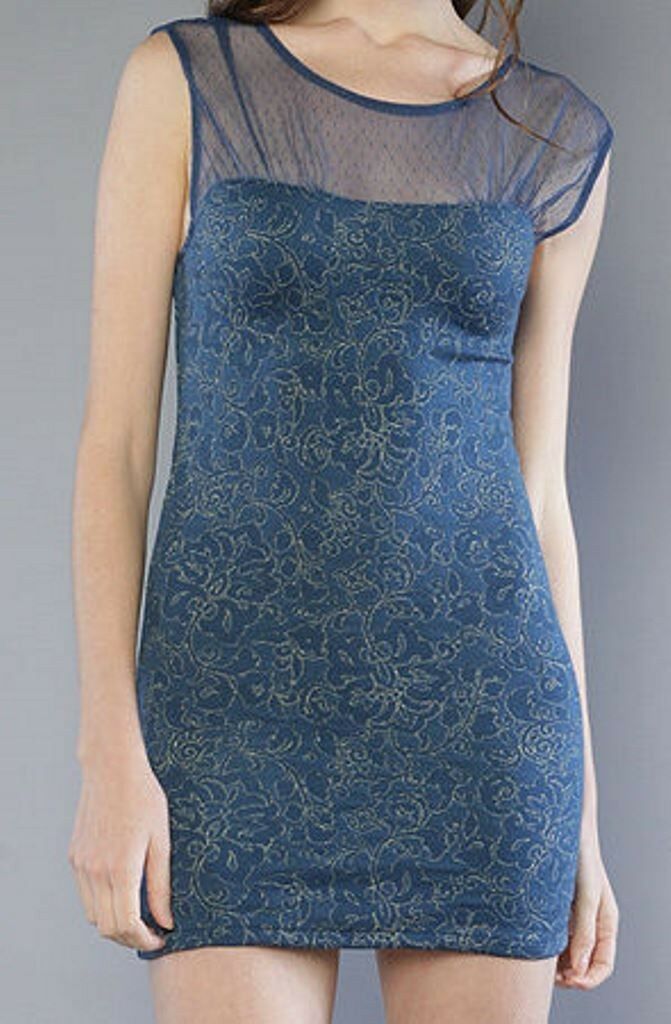 Tight fitting bodycon dress with allover metallic floral stitching; matching mesh neckline and sleeves with allover tonal swiss dot design; body 88% acrylic 7% nylon 4% lurex. by Free People