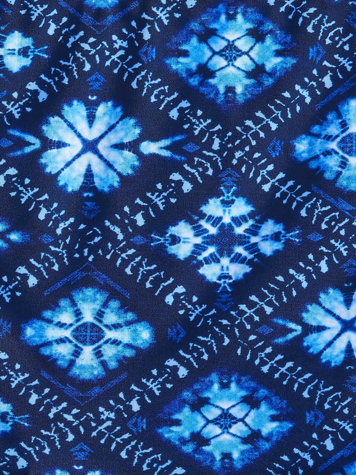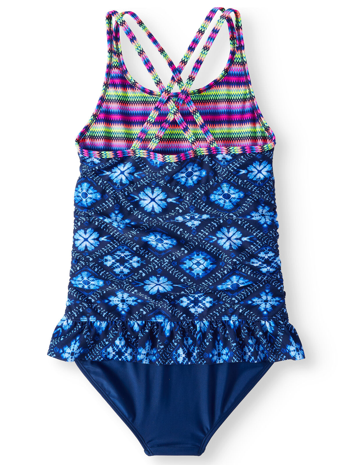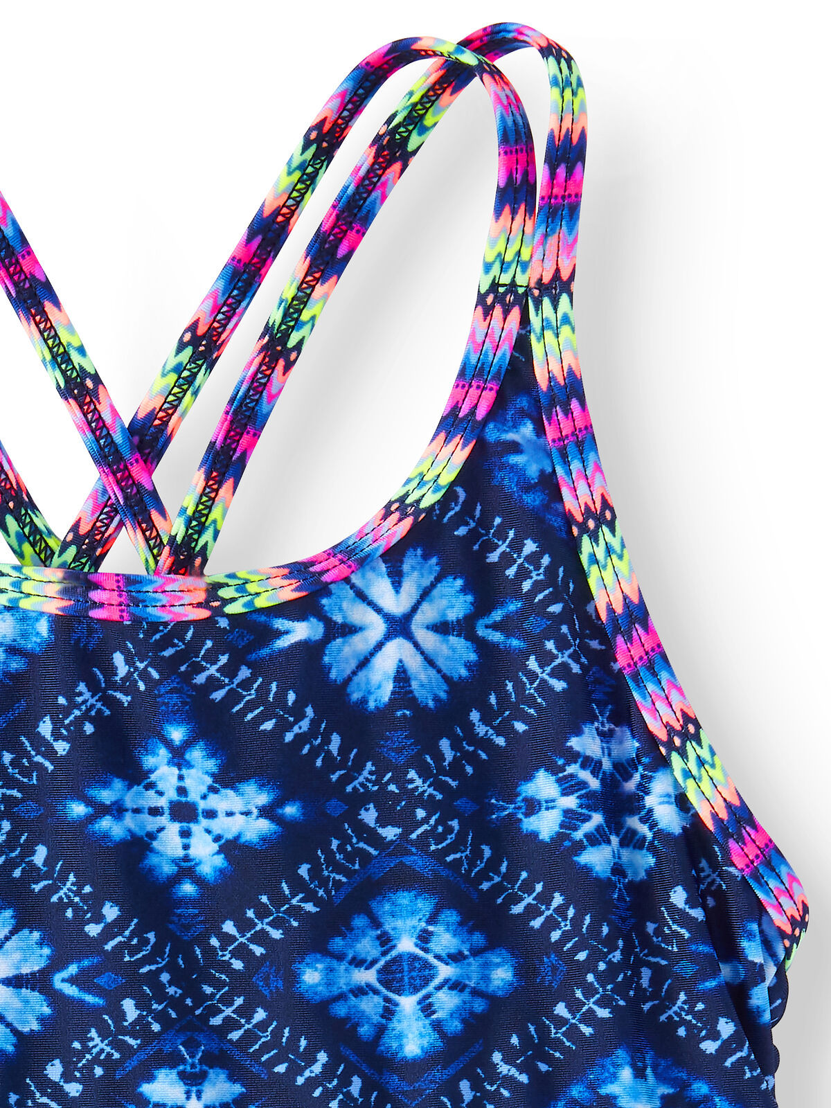 This girls one-piece swimsuit features double criss-cross straps, waist ruffle and cinching bodice details. The bold colorful mosaic print will make a statement while she' comforable and stylish.