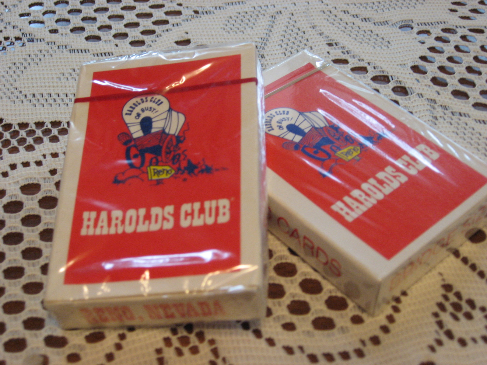 Harold's Club opened its doors on Bourbon Street in downtown Reno in 1935. The casino closed for good in 1995 and building was torn down. For the collector here are two decks of playing cards still sealed. Also still wrapped in clear cellophane are dice key chain, clear acrylic with blue letters key chain and a magnetic note holder as a customer appreciation give aways. Items are vintage not reproductions. Look in my booth for more Harold's Club and other casino memorabilia.
