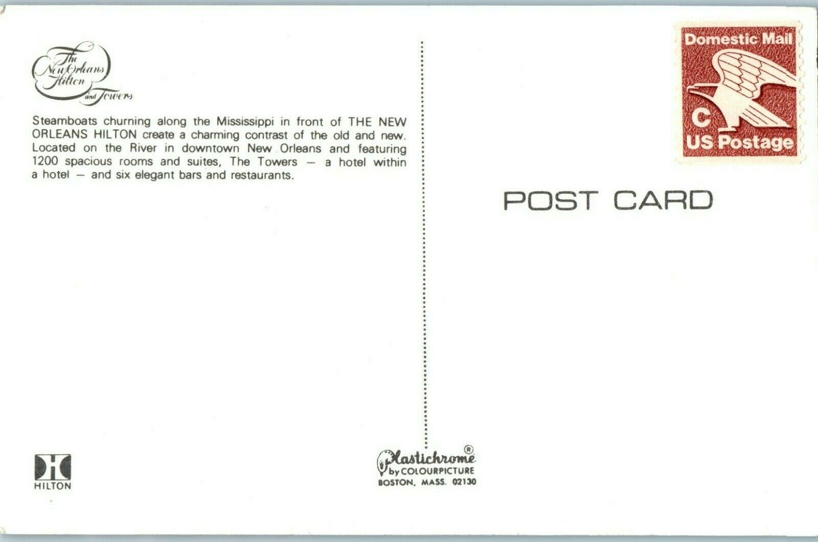 Steamboat on the Mississippi at New Orleans Hilton Postcard w / Domestic Mail C Stamp - Stamp has not been cancelled.