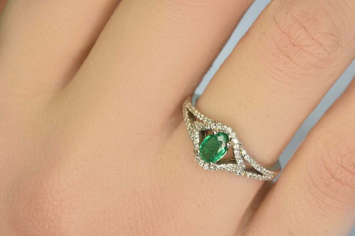 2.20Ct Oval Cut Green Emerald Evil Eye Engagement Ring 14K White Gold Finish