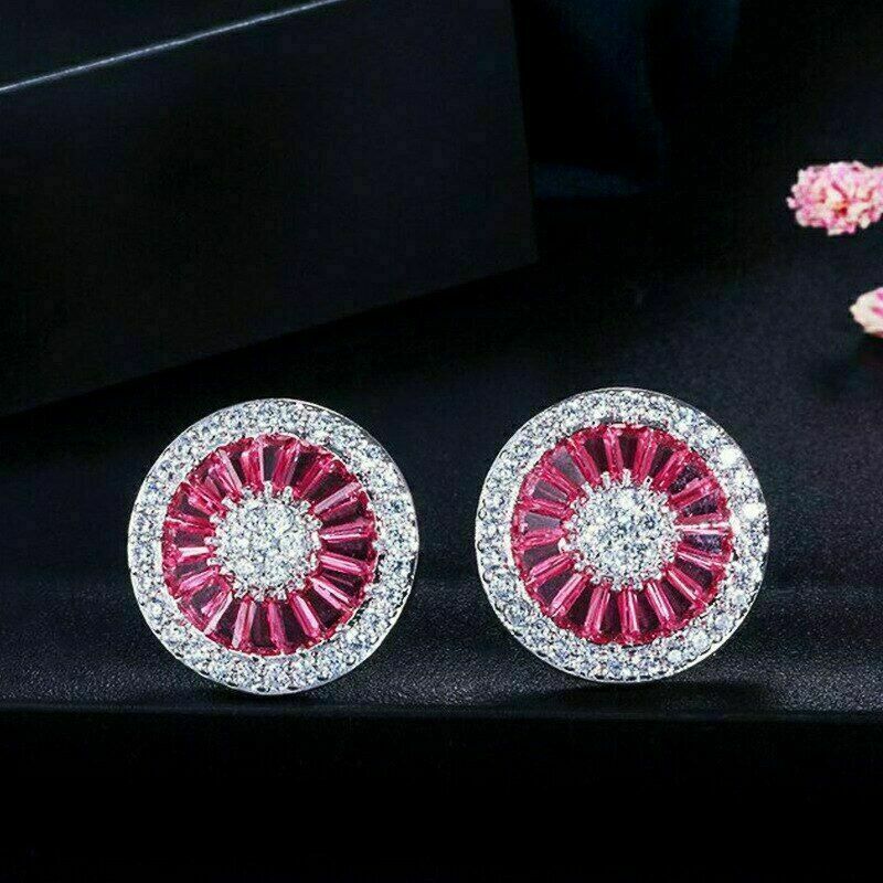 2.80Ct Baguette Cut Red Ruby Push Back Halo Stud Earrings 14K White Gold Finish