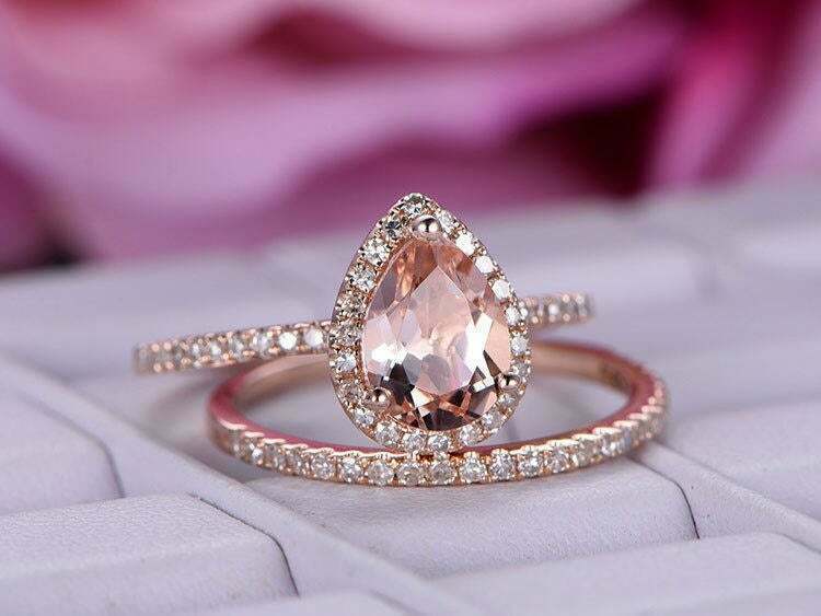 2.55Ct Pear-Cut Morganite Bridal Set Halo Engagement Ring 18K Rose Gold Finish