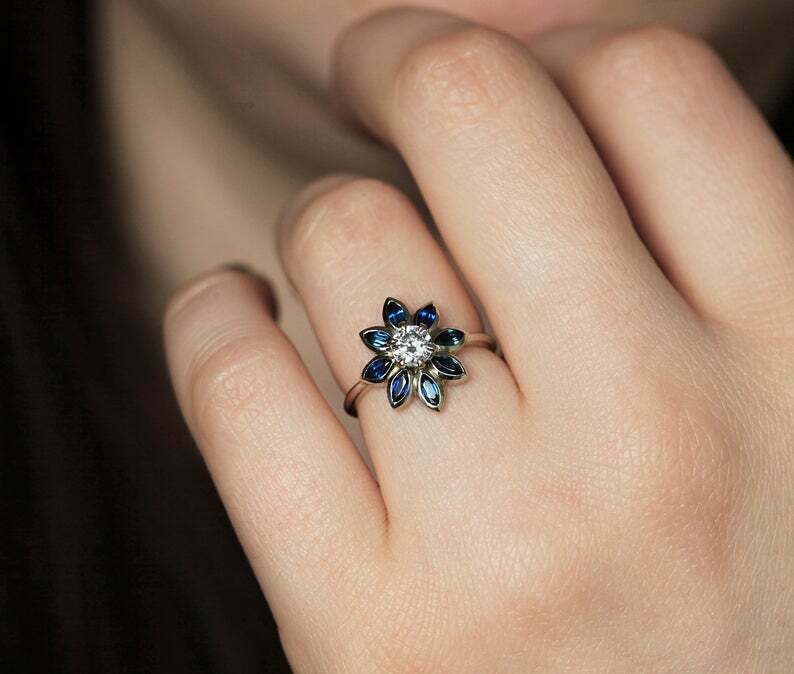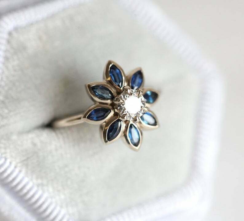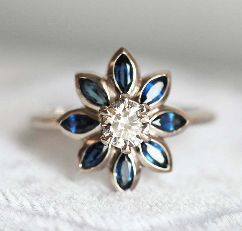2ct Marquise Cut Blue Sapphire Diamond Flower Wedding Ring 14k White Gold Finish