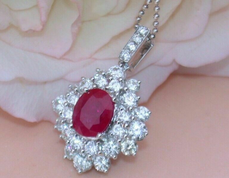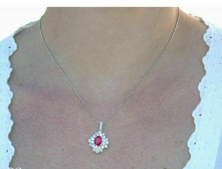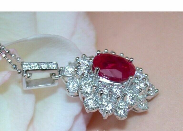 2.30Ct Oval Cut Red Ruby Burmese Halo Pendant 14K White Gold Finish Free Chain