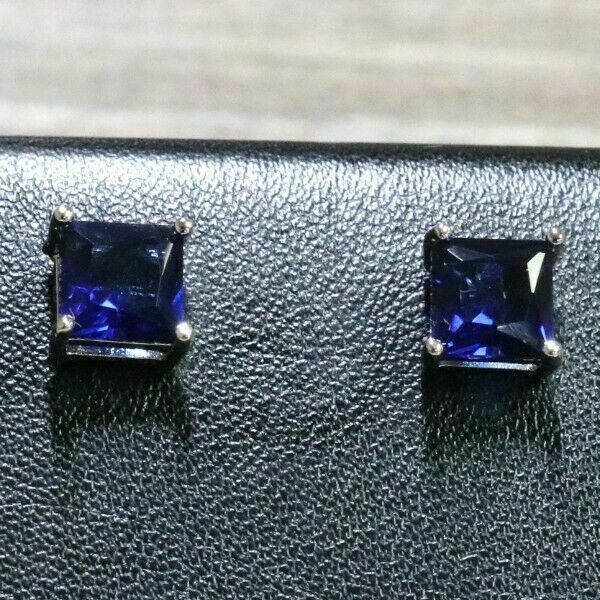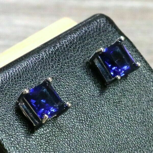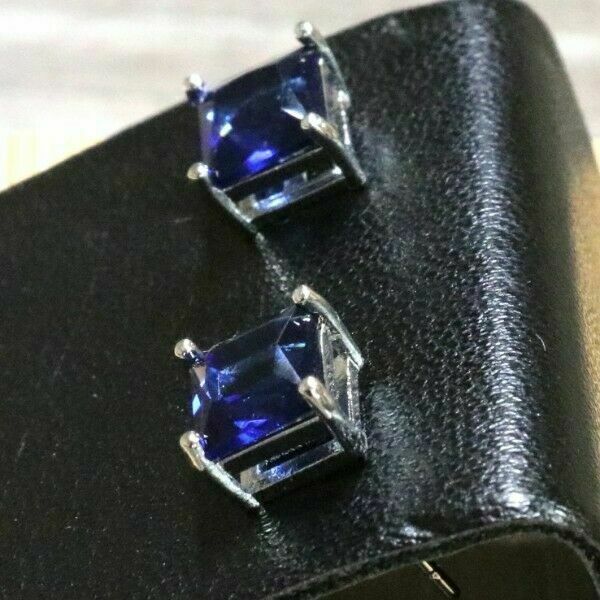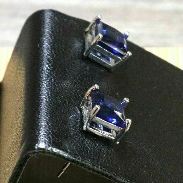4Ct Princess Cut Blue Sapphire Solitaire Stud Earrings In 14K White Gold Finish