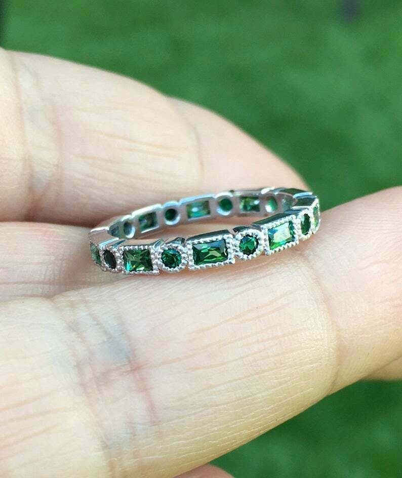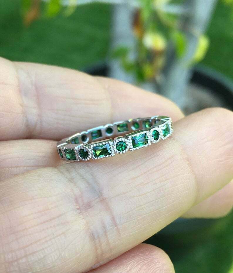 1.20Ct Emerald Cut Green Emerald Wedding Band Ring in 14K White Gold Finish