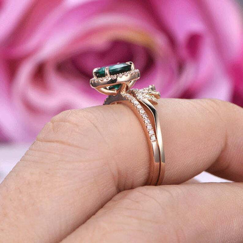2.65Ct Round Cut Green Emerald Bridal Set Halo Engagement Ring 14K Rose Gold FN