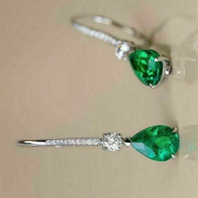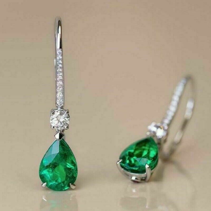 4.20Ct Pear Cut Green Emerald Drop Dangle Earrings in 14K White Gold Finish