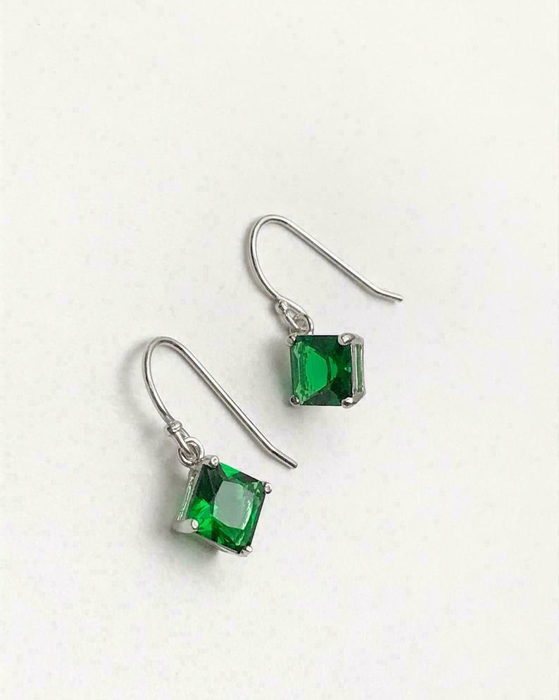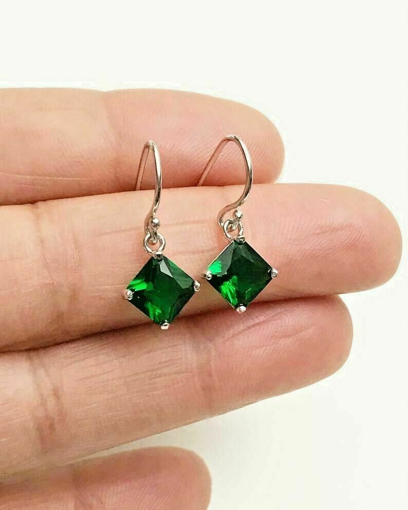 4Ct Princess Cut Green Emerald Green Drop Dangle Earrings 14K White Gold Finish