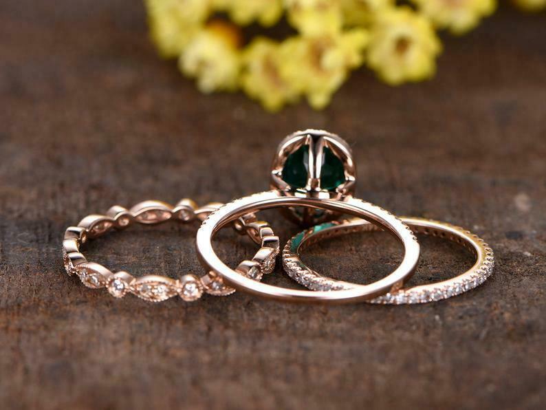 2.85Ct Oval Cut Green Emerald Trio Set Engagement Ring 14K Rose Gold FiN