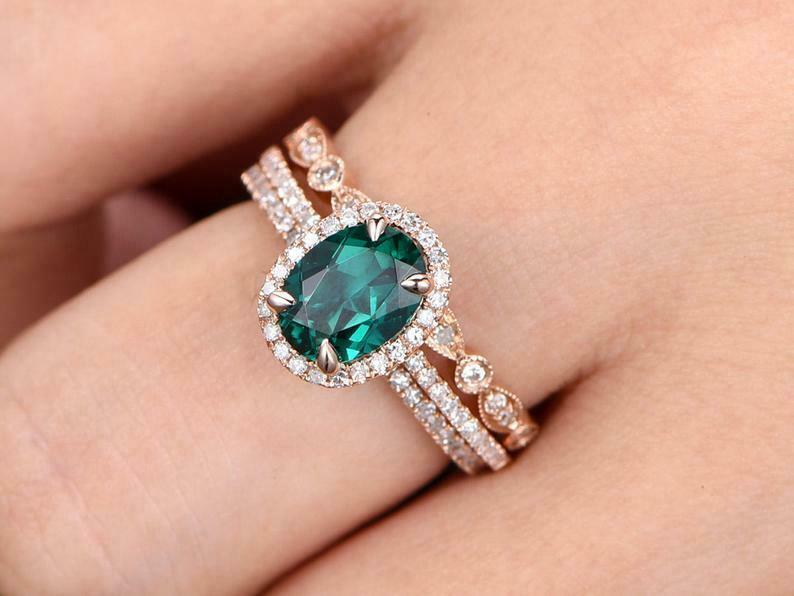 2.85Ct Oval Cut Green Emerald Trio Set Engagement Ring 14K Rose Gold Finish