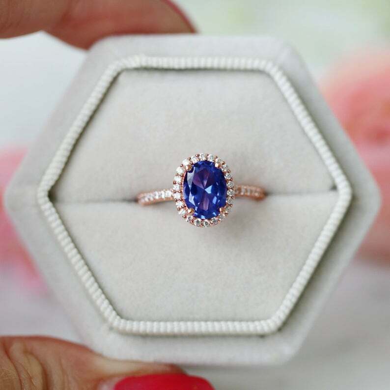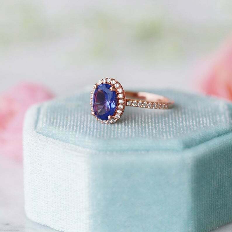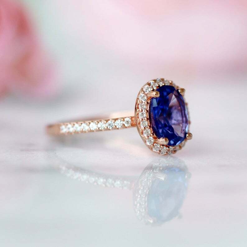 2Ct Oval-Brilliant Cut Blue Sapphire Halo Engagement Ring 18K Rose Gold Finish