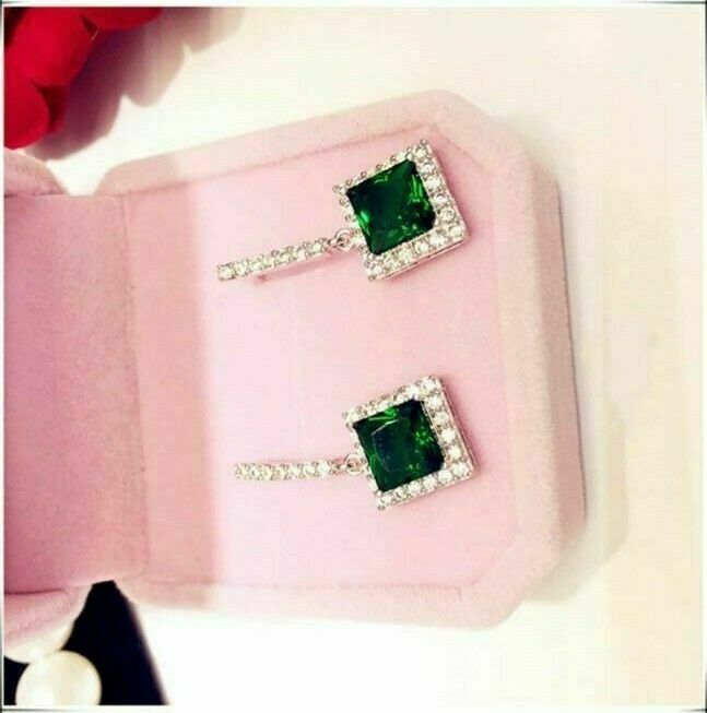 4Ct Princess Cut Green Emerald Drop & Dangle Stud Earrings 14K White Gold Finish