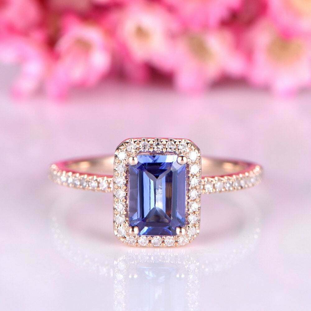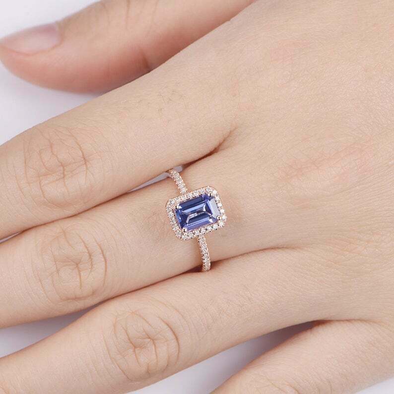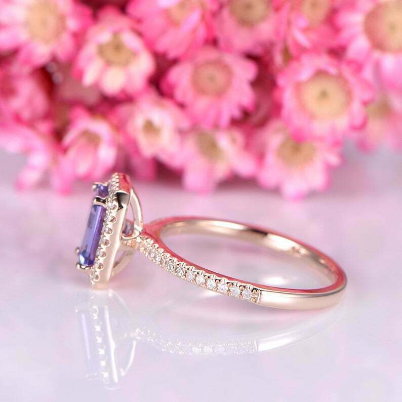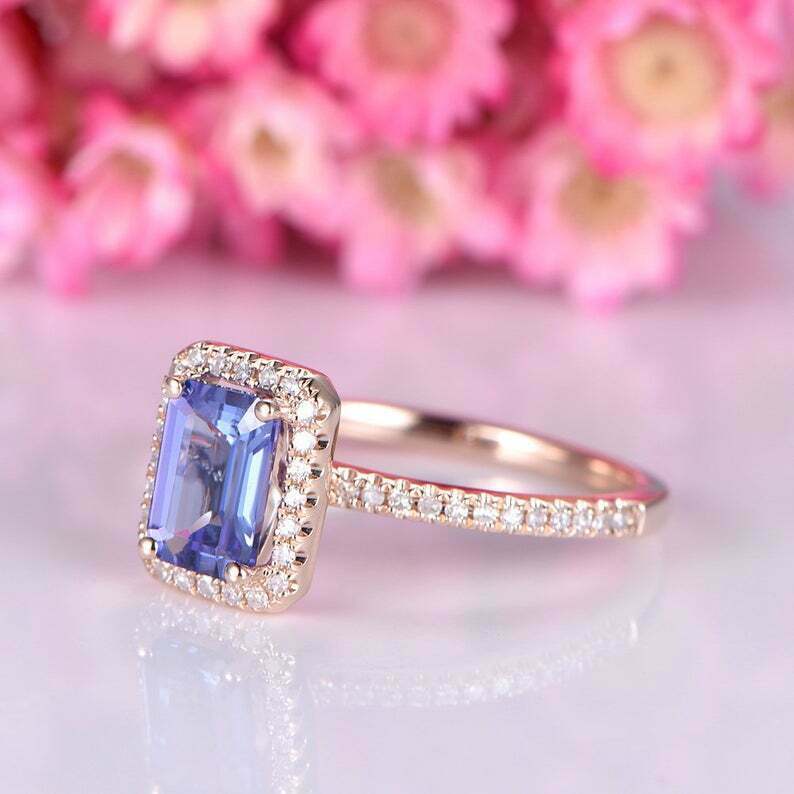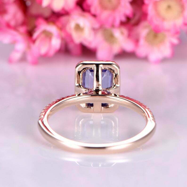 2.20Ct Emerald Cut Blue Sapphire Halo Engagement Ring 14K Rose Gold Finish
