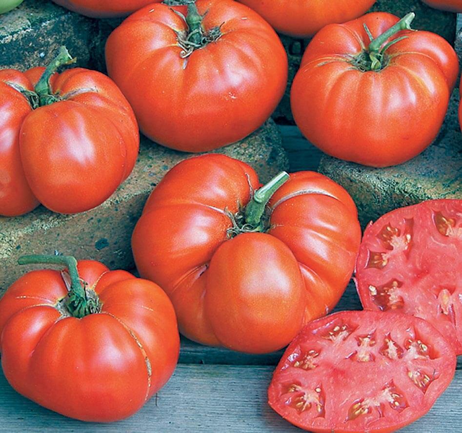 Deliciously sweet, large fruit, red tomatoes can be used in salads or served on BLT sandwiches.85 days. Here is the original beefsteak heirloom tomato. Beefsteak will conjure memories of how real tomatoes taste. Huge, fragrant, delicious red fruits, up to 2 pounds or more on a big vine, this amazing plant will need extra support to keep up with the giant, juicy, sweet and scrumptious old-time tomatoes. A classic. High in Vitamins A and C. To keep fruit clean and easier to pick, support with stakes or cages. Tomatoes require at least 1 inch of water per week. Start seed indoors in a sunny location 2 weeks prior to warm weather. Seed can be sown directly into garden when soil is warm. Transplant outdoors in full sun when seedlings display 4-6 leaves and weather is warm. Zones 3-10.