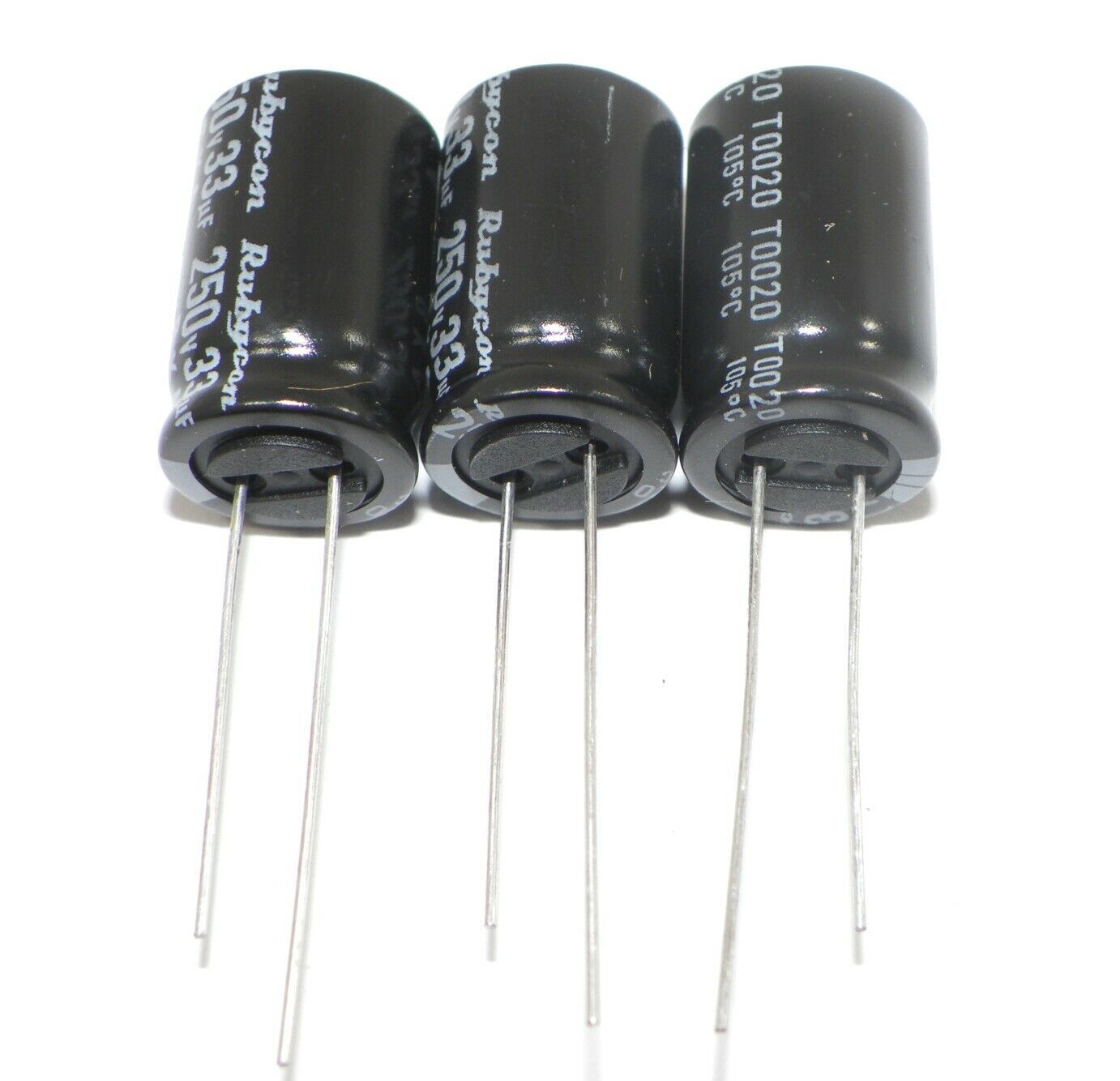 This sale transaction is for a Rubycon T0020 Radial Electrolytic Capacitor 33uF 250V 20% Tolerance 3 Pcs. included exactly what is pictured.