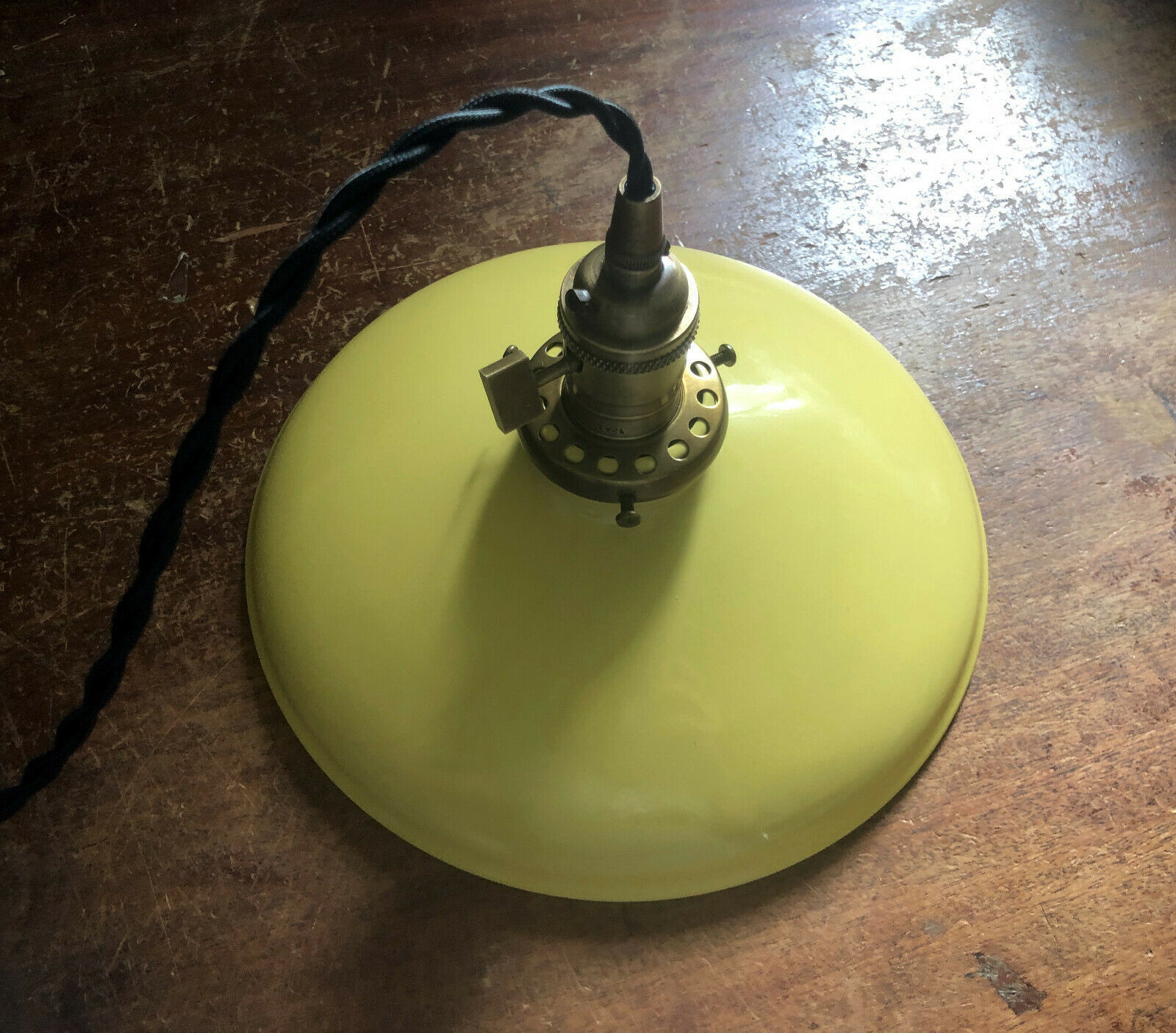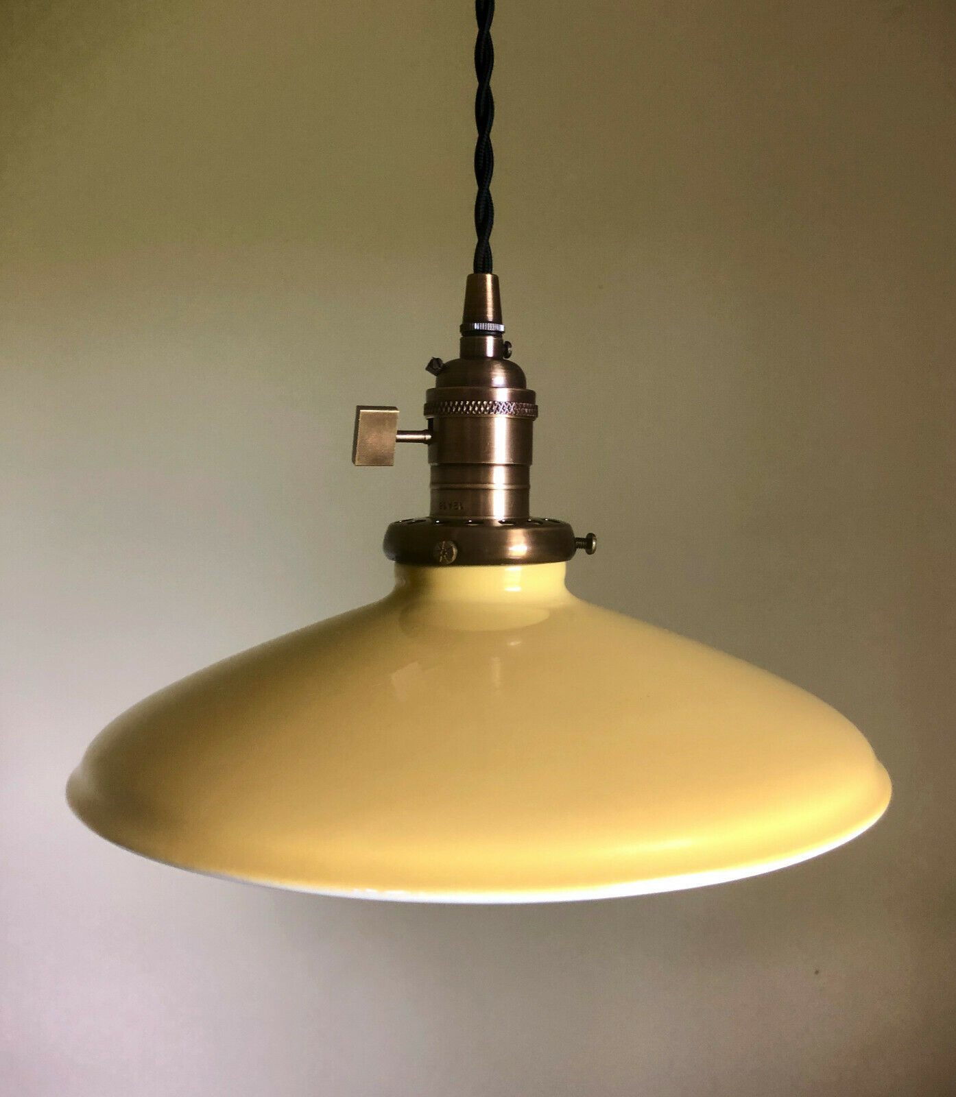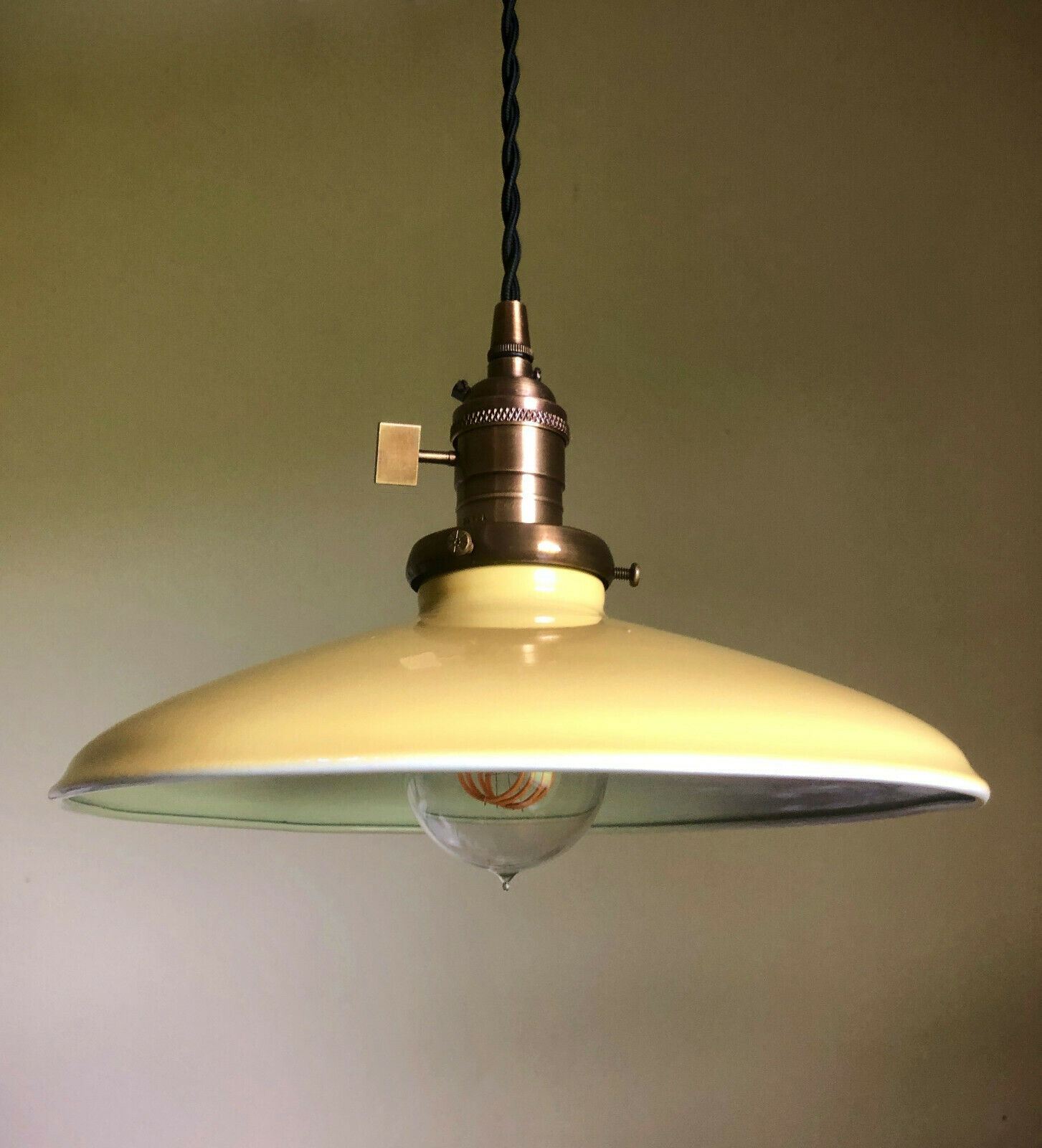 A true replica of the vintage farmhouse shades of the past, these porcelain enamel finish metal shades are a thing of beauty! Recreate that vintage style without having to hunt down overpriced antiques covered in rust and dirt. Heavy duty, industrial, gorgeous, these are the real deal. Yellow on the top, the inside is white, they are 10 inches wide and the neck is made for a 2-1/4" shade holder (we sell the fitters in many finishes, as well as the threaded sockets needed to mount them. Plus vintage style cloth cord, Edison bulbs, plugs, canopies, cages... EVERYTHING you'll need to make your own DIY vintage style lighting and save a bundle.) This Listing is for the SHADE ONLY, no socket or shade fitter included, all other parts shown for demonstration and are available separately in our sto
