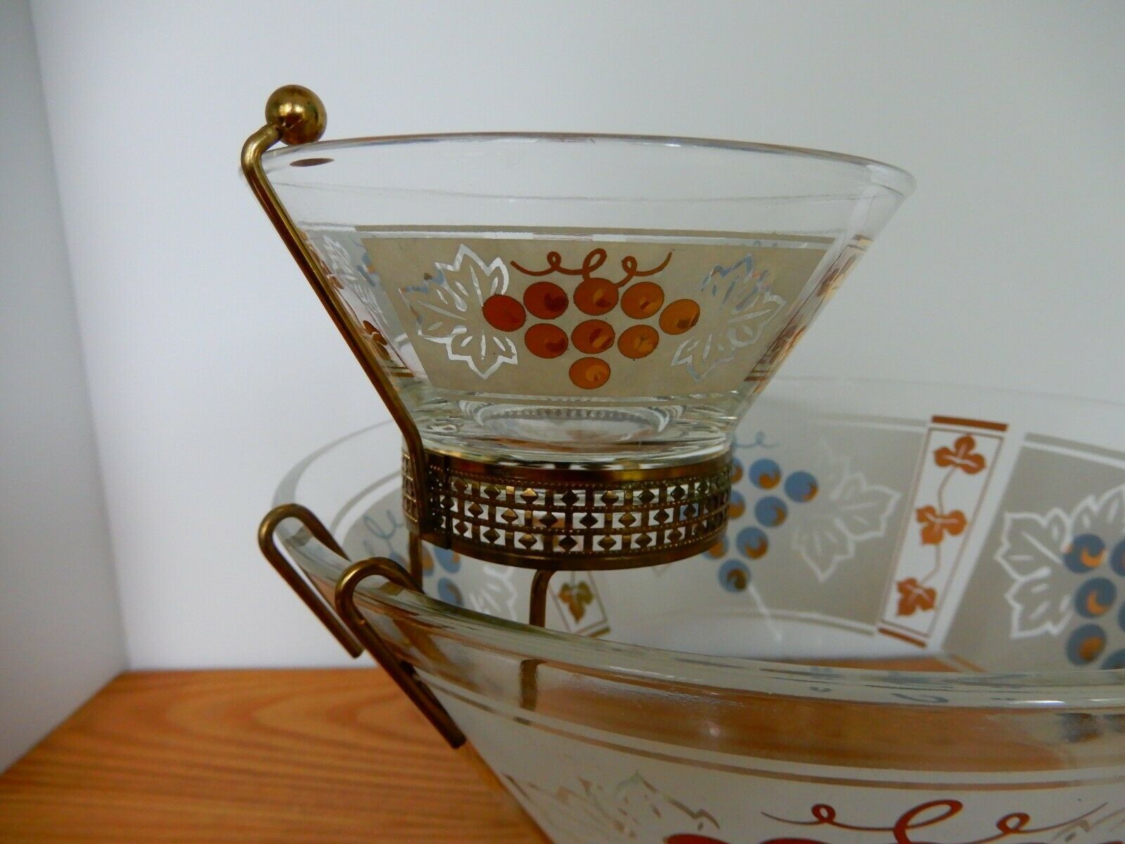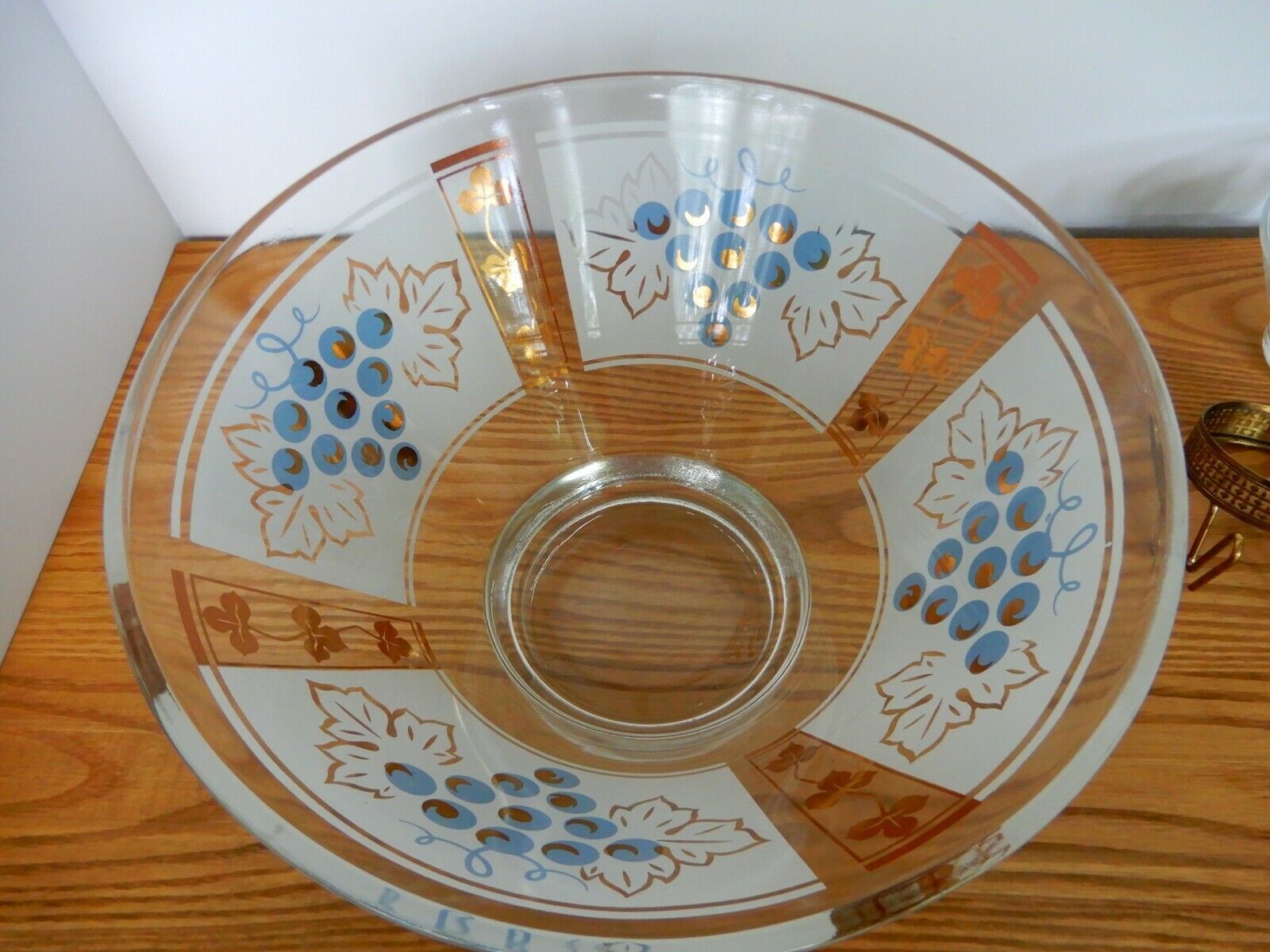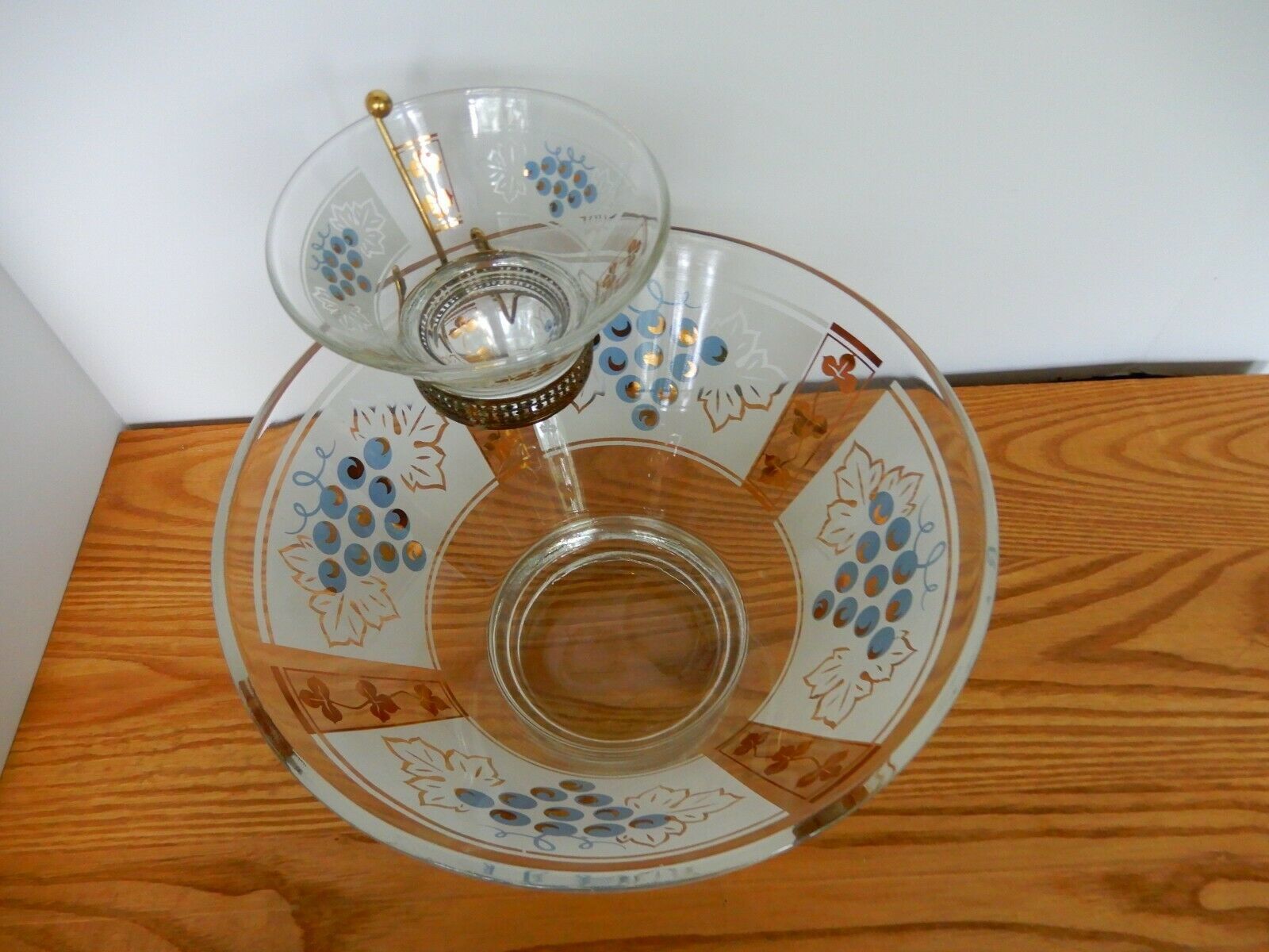Vtg MCM grapes & leaves chip & dip bowl set Anchor Hocking gold tone w/ stand