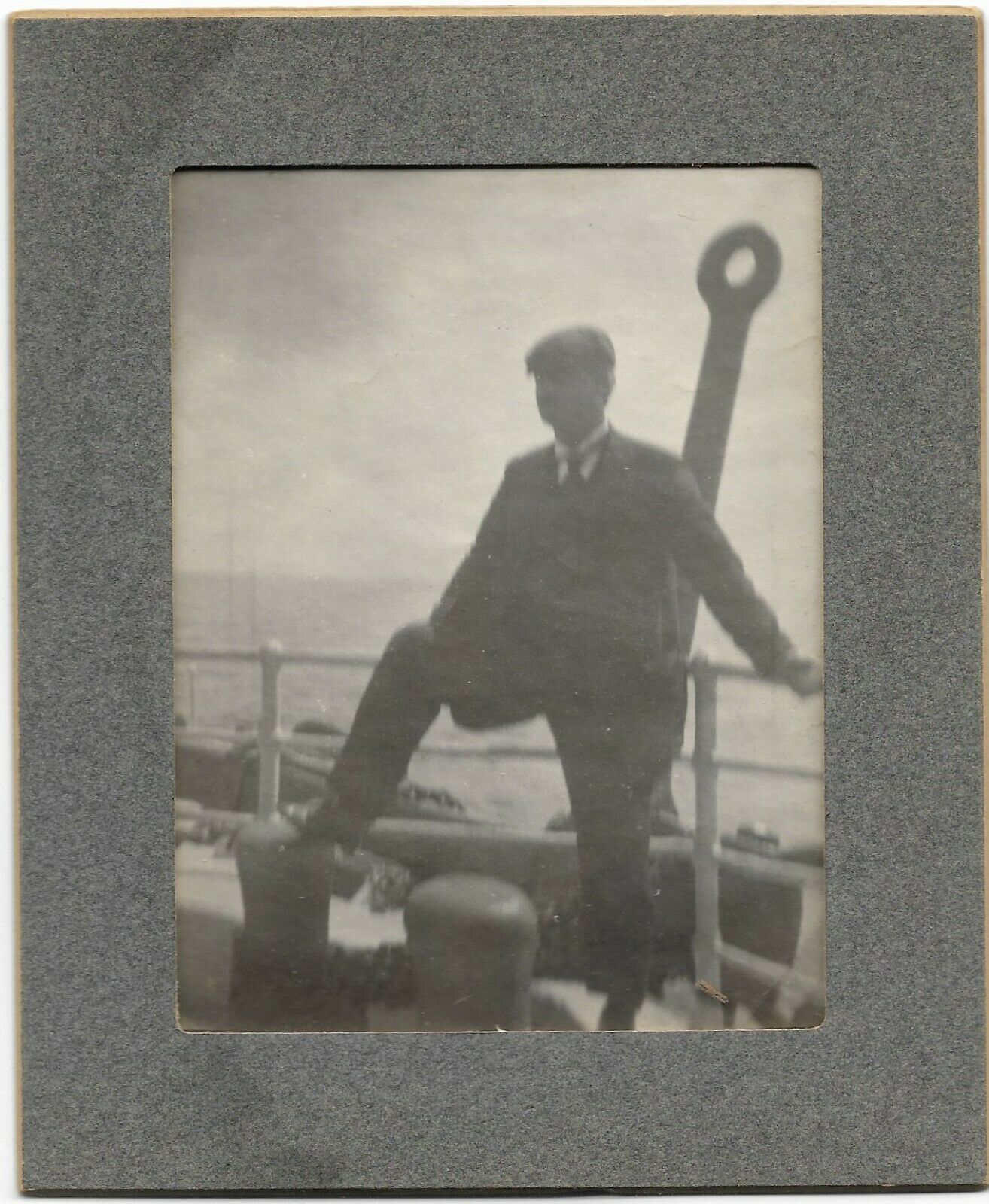 Turn of the century cabinet card man leaning on a ship railing near an anchor