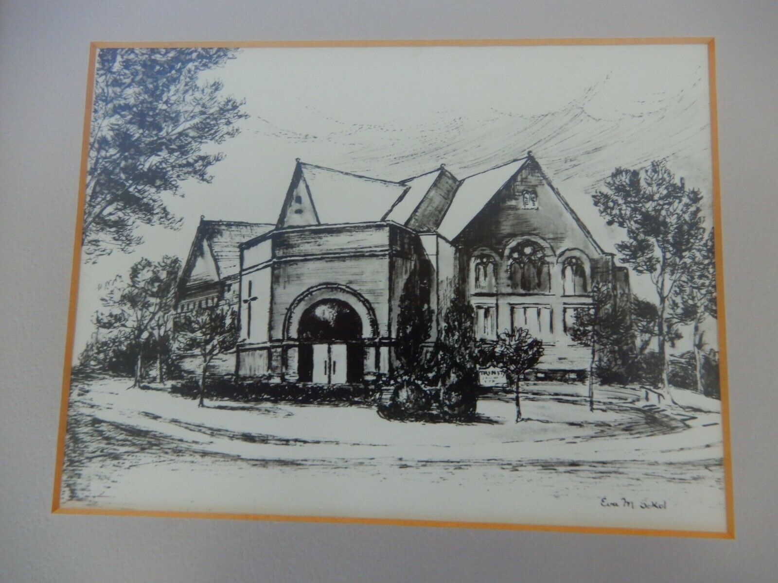 Framed & matted pencil drawing of Faith United Methodist Church by Eva M. Sokol