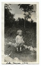 1924 4.5 x 2.75 inch photograph of a young girl in a jumpsuit at Lake Taconic